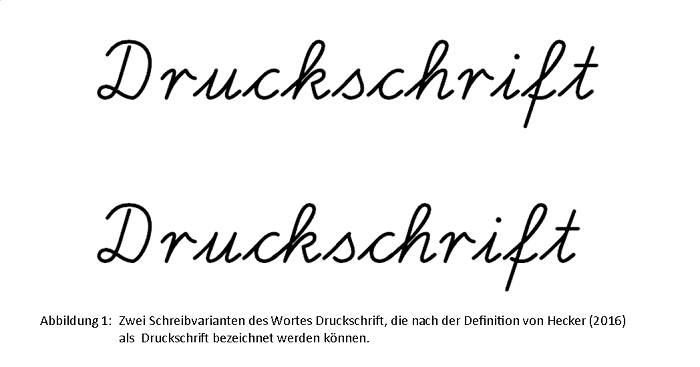 Zu allem Übel entwirft Hecker auch noch eine Definition von Druckschrift, die in ihrer Ausformulierung so beliebig ist, dass mittels unverbundener oder wenig verbundener Schreibschriftbuchstaben geschriebene Worte nach heckerscher Lesart als Druckschrift aufgefasst werden können.